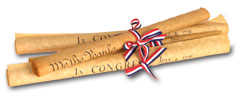 Faux parchment scrolls of the Declaration of Independence, the Constitution of the United States and the Bill of Rights, with or without quill pens.