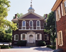 Carpenters’ Hall was built in 1770. The First Continental Congress met at Carpenters’ Hall in September 1774 to draw up a Declaration of Rights and Grievances and an appeal to King George III. This was in response to the Colonies’ outrage towards the British Parliament over punishing Massachusetts for the Boston Tea Party. During the Revolutionary War, Carpenters’ Hall served as a hospital and an arsenal for American forces. It was here at Carpenters’ Hall during the First Continental Congress that Patrick Henry stated, “The distinctions between Virginians, Pennsylvanians, New Yorkers, New Englanders are no more. I am not a Virginian but an American.”