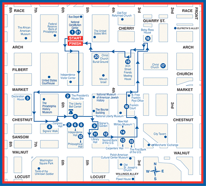The Constitutional Walking Tour starts and ends at the National Constitution Center at 525 Arch Street, Philadelphia, PA 19106. Tours meet at the 3 large stone benches immediately outside the main entrance to the National Constitution Center.